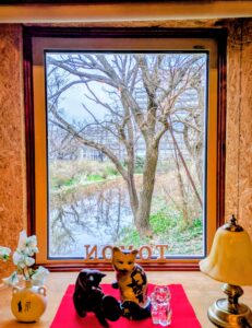 画像は当店の窓から見える“亀ヶ池”。盛岡城のお堀なのです。氷が溶けて水面に桜並木が映っています。これから花が咲き、蓮が茂ります。時折その移ろいを撮影してはupしますね。